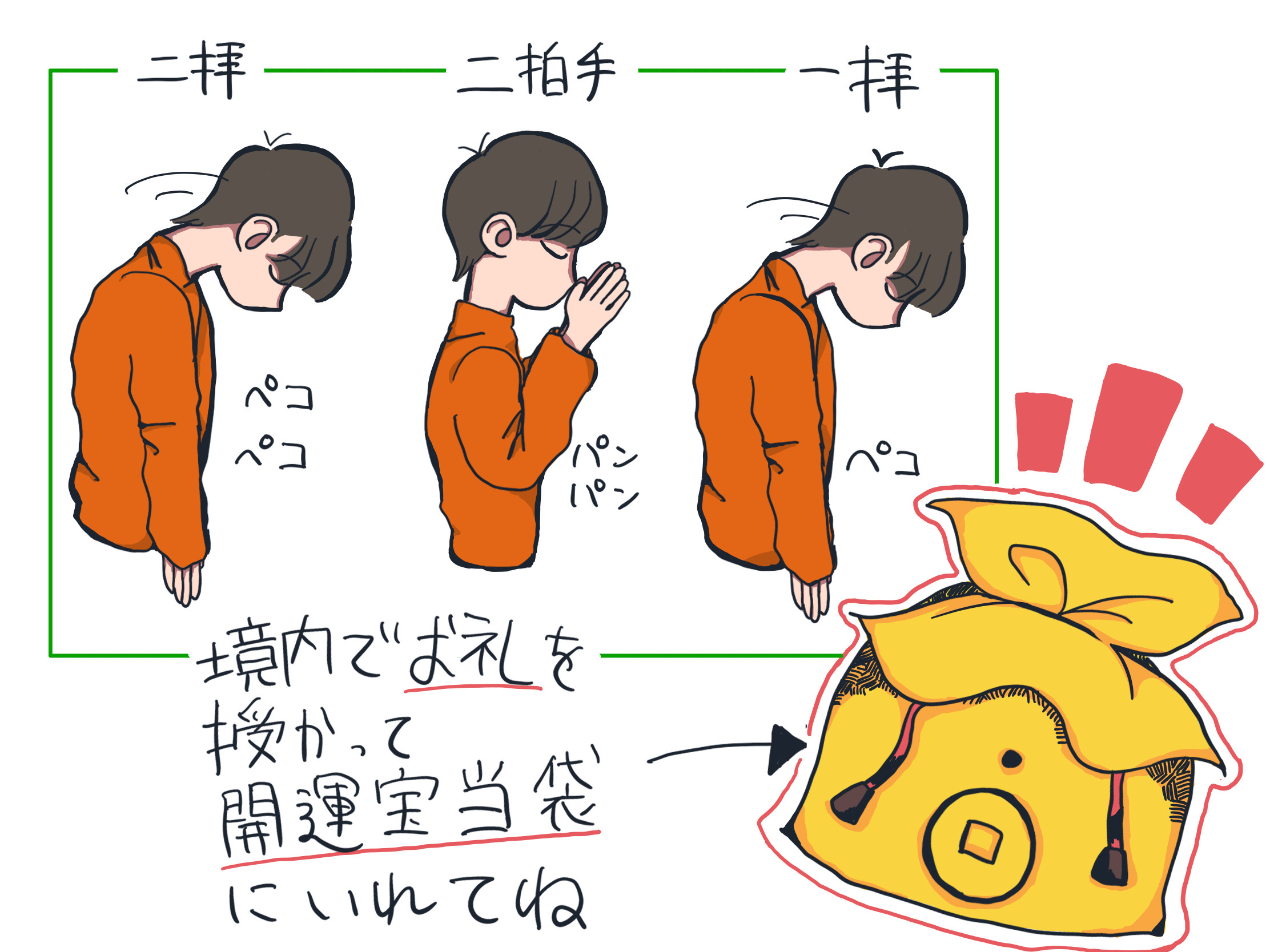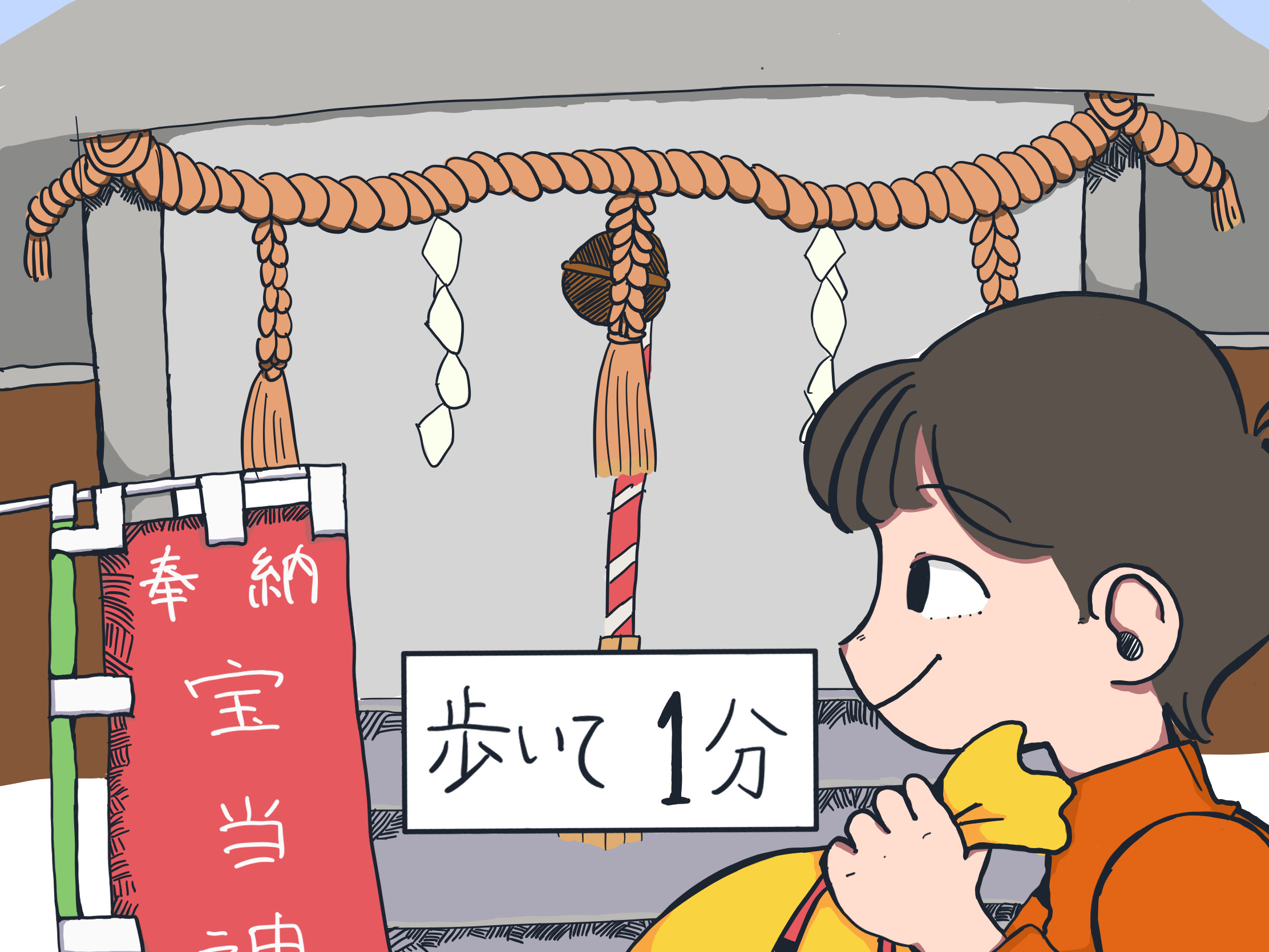 神社までは、108歩、徒歩1分です。神社までは、袋の口は開けたままお持ちください。